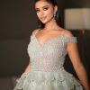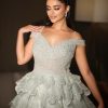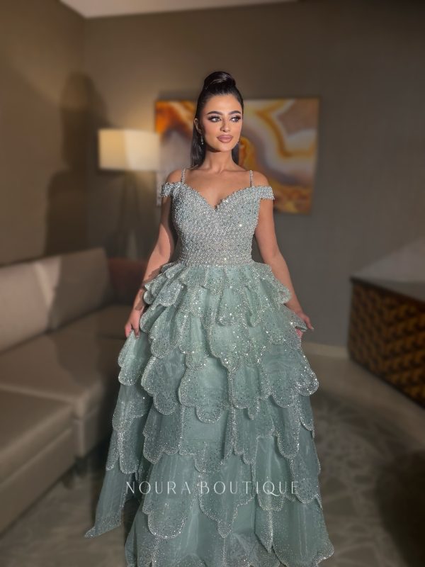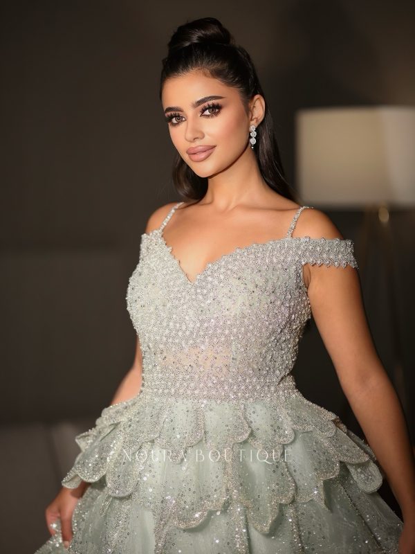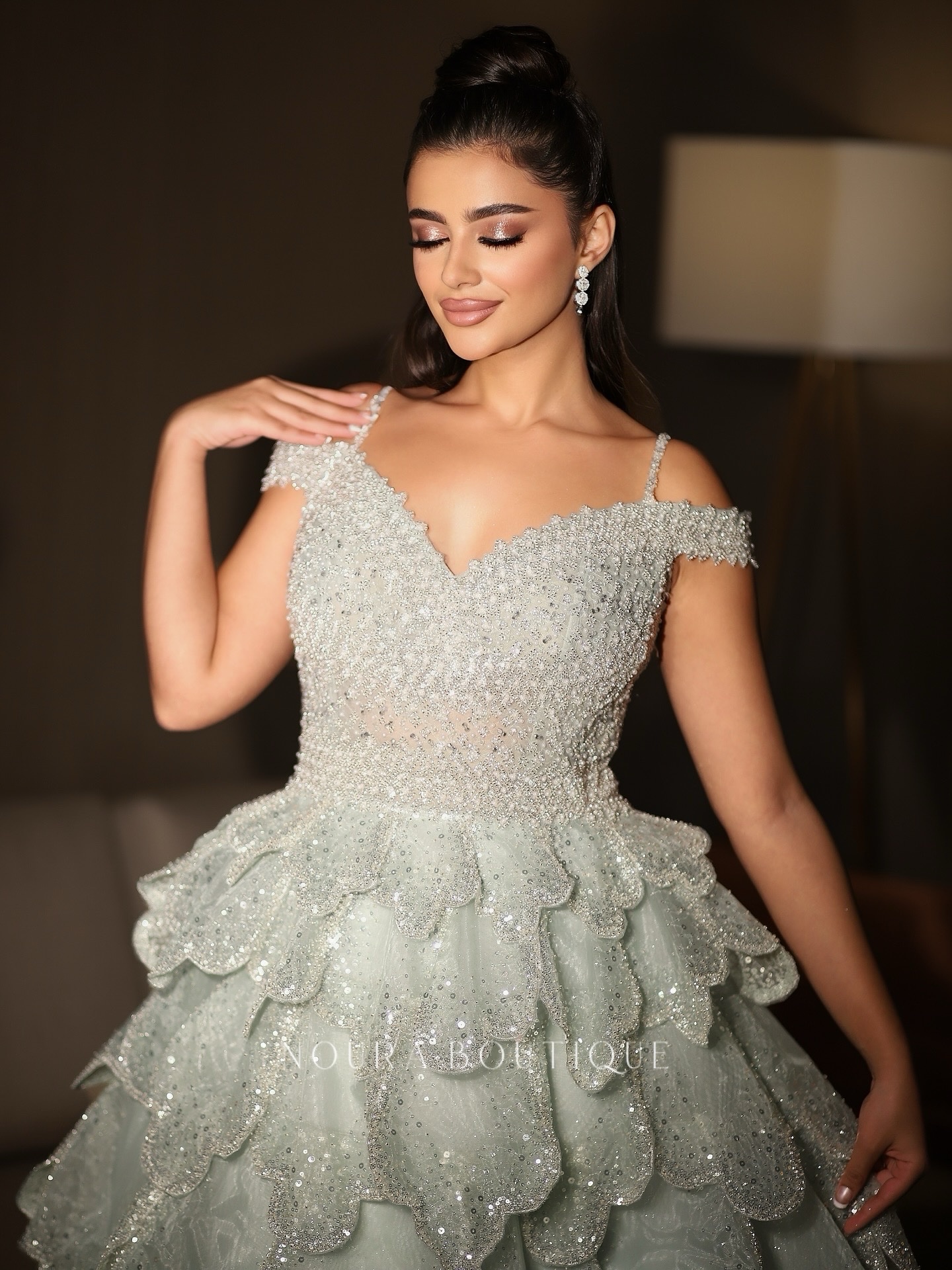 Step into timeless elegance with the Celestia Cascade Gown from Noura Couture. This enchanting creation features a shimmering bodice adorned with intricate beadwork, gracefully paired with tiered scalloped layers that flow like cascading petals. The soft mint hue, kissed with a glittering finish, captures the magic of moonlight on water — perfect for bridesmaids, evening galas, or a grand engagement celebration.